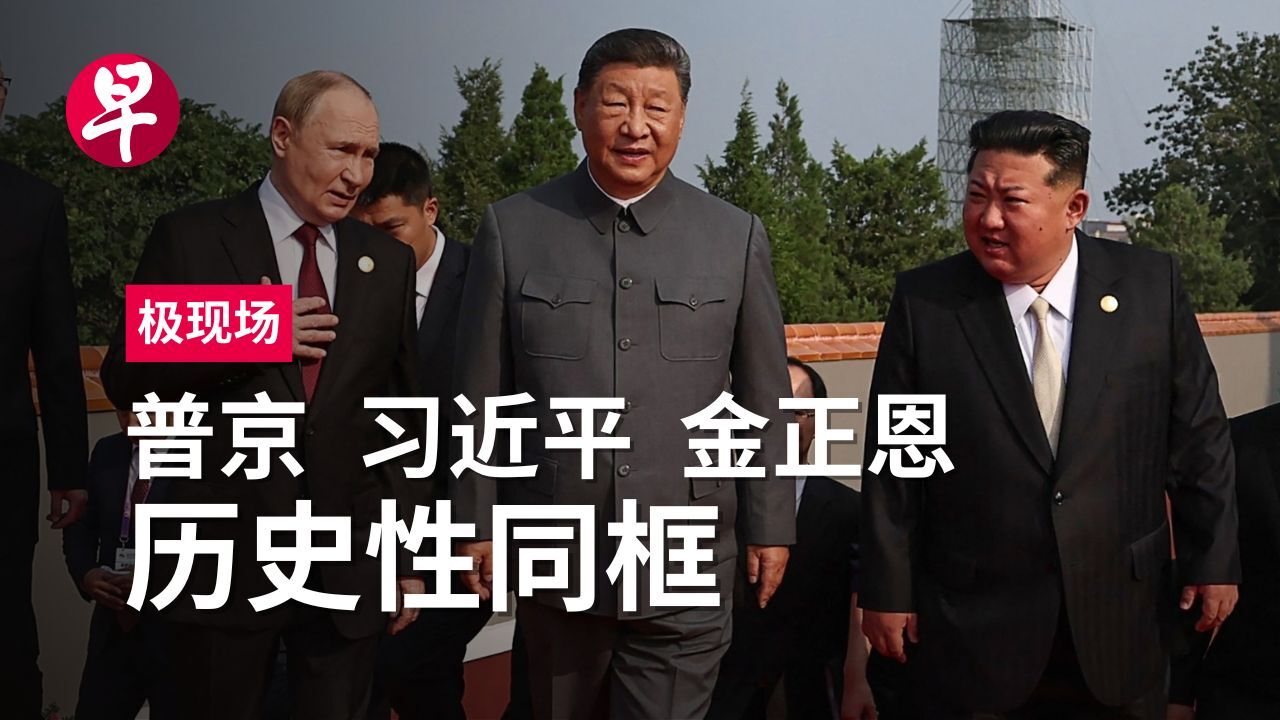 8点30左右,身着中山装的习近平与外国贵宾开始登上天安门城楼。金正恩和普京分别站在习近平左右两侧,从大荧幕看,三人交谈甚欢。